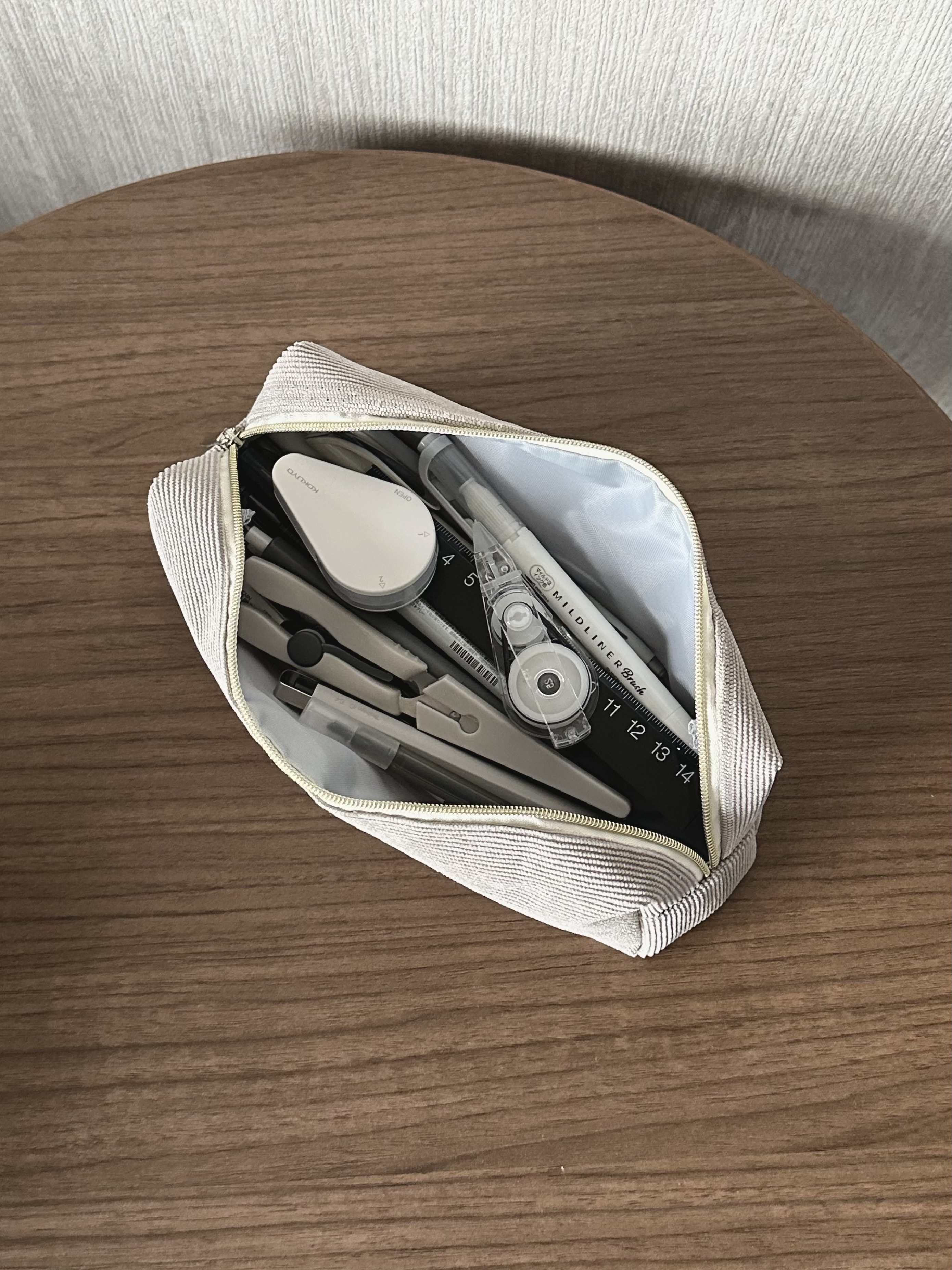 ファスナーを開くと中が見渡せるので、取り出しもスムーズ。デスクの上でも自立してくれて使いやすさ抜群。