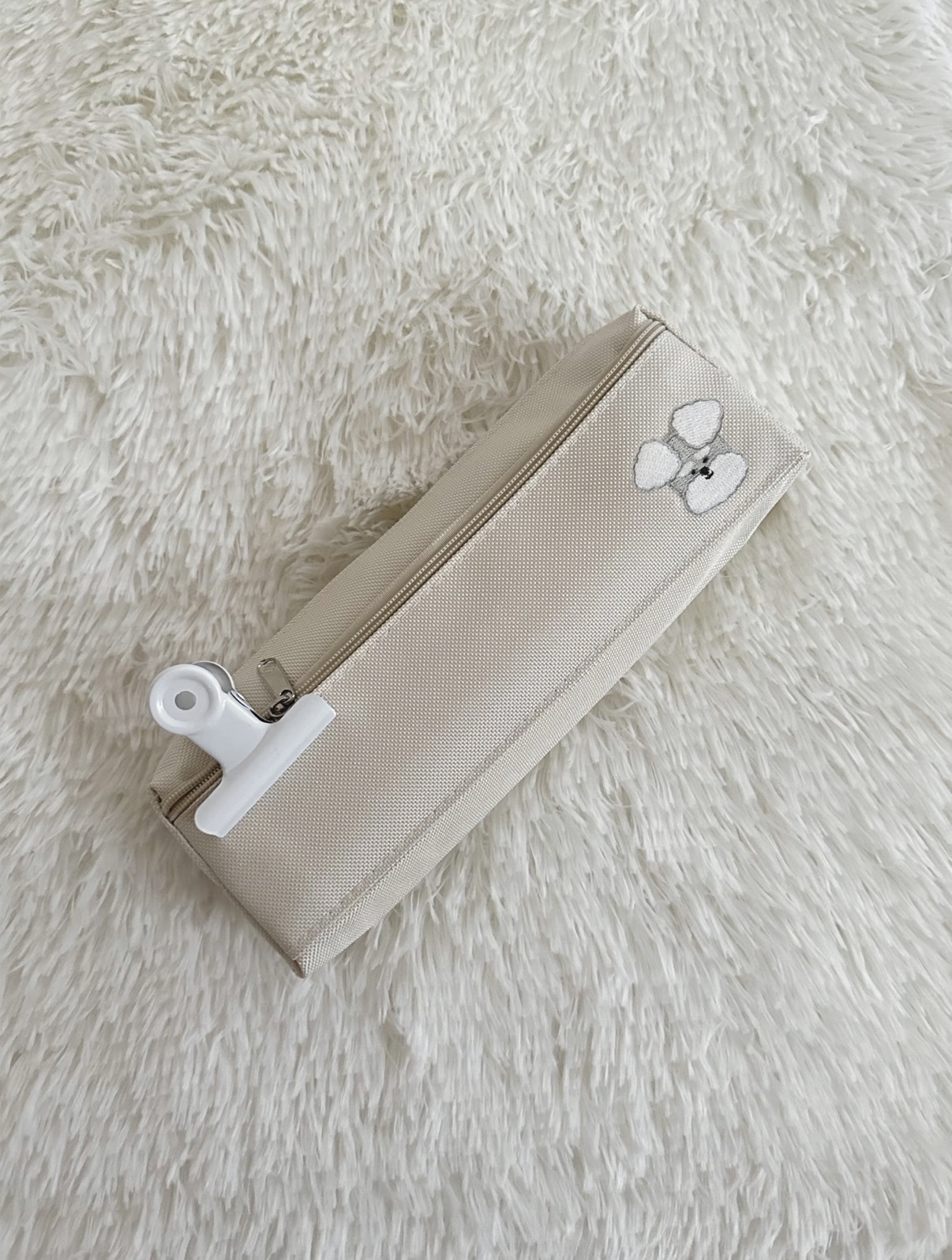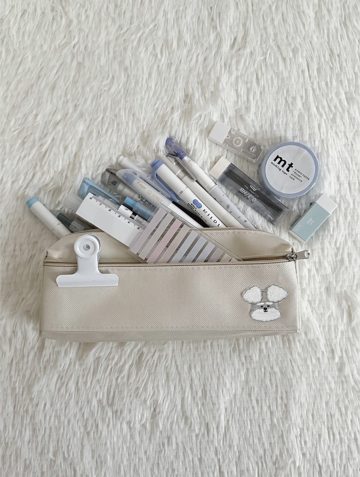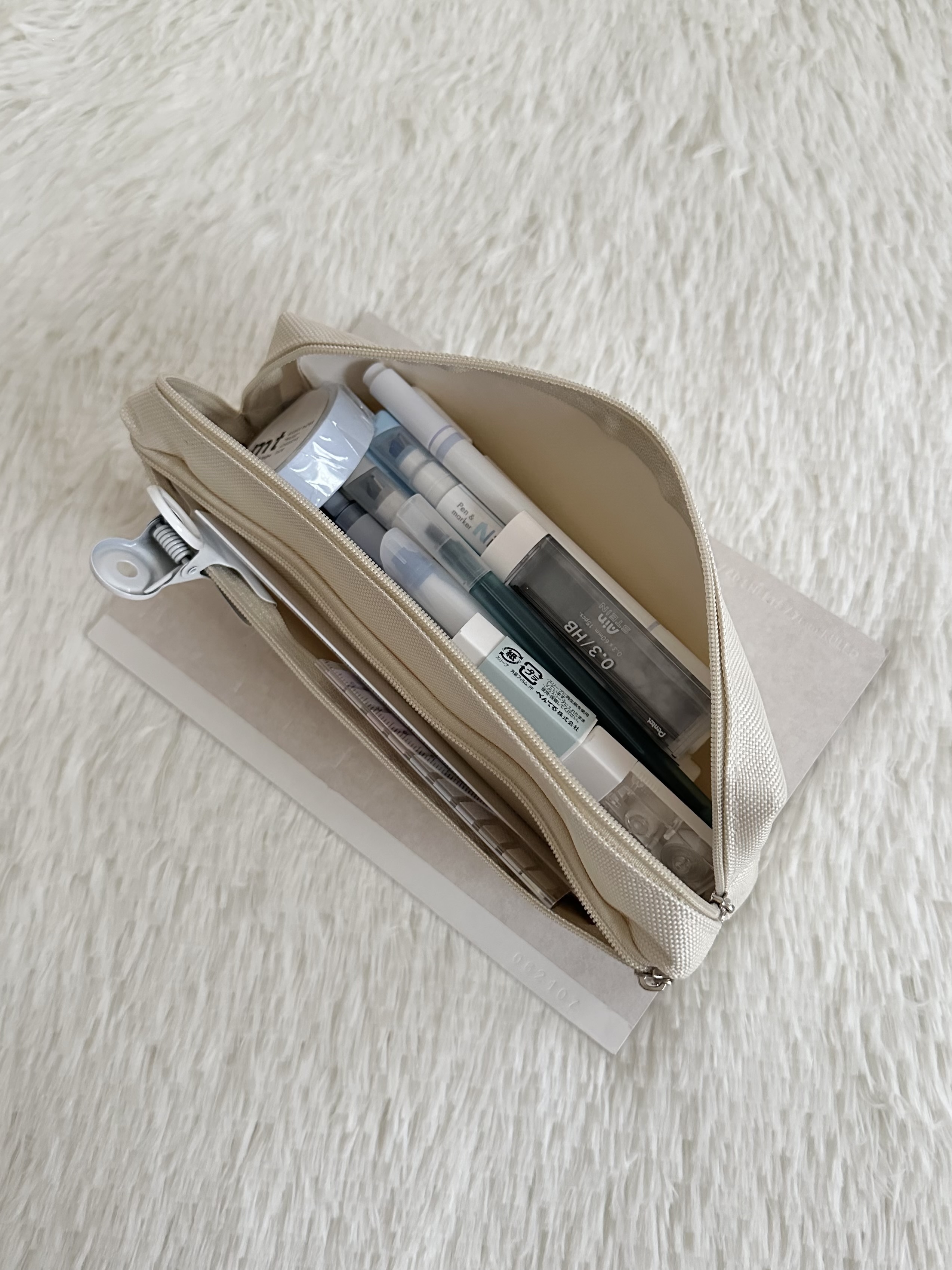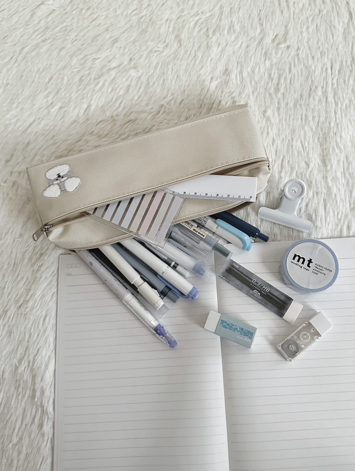 メインポケットは大容量で、ペンや文房具、小物までしっかり収納。自立する形なので、机の上でもすっきり整います。
