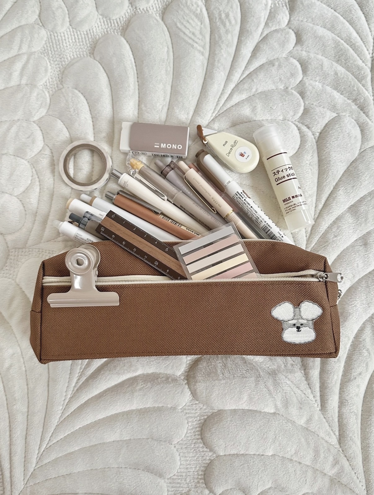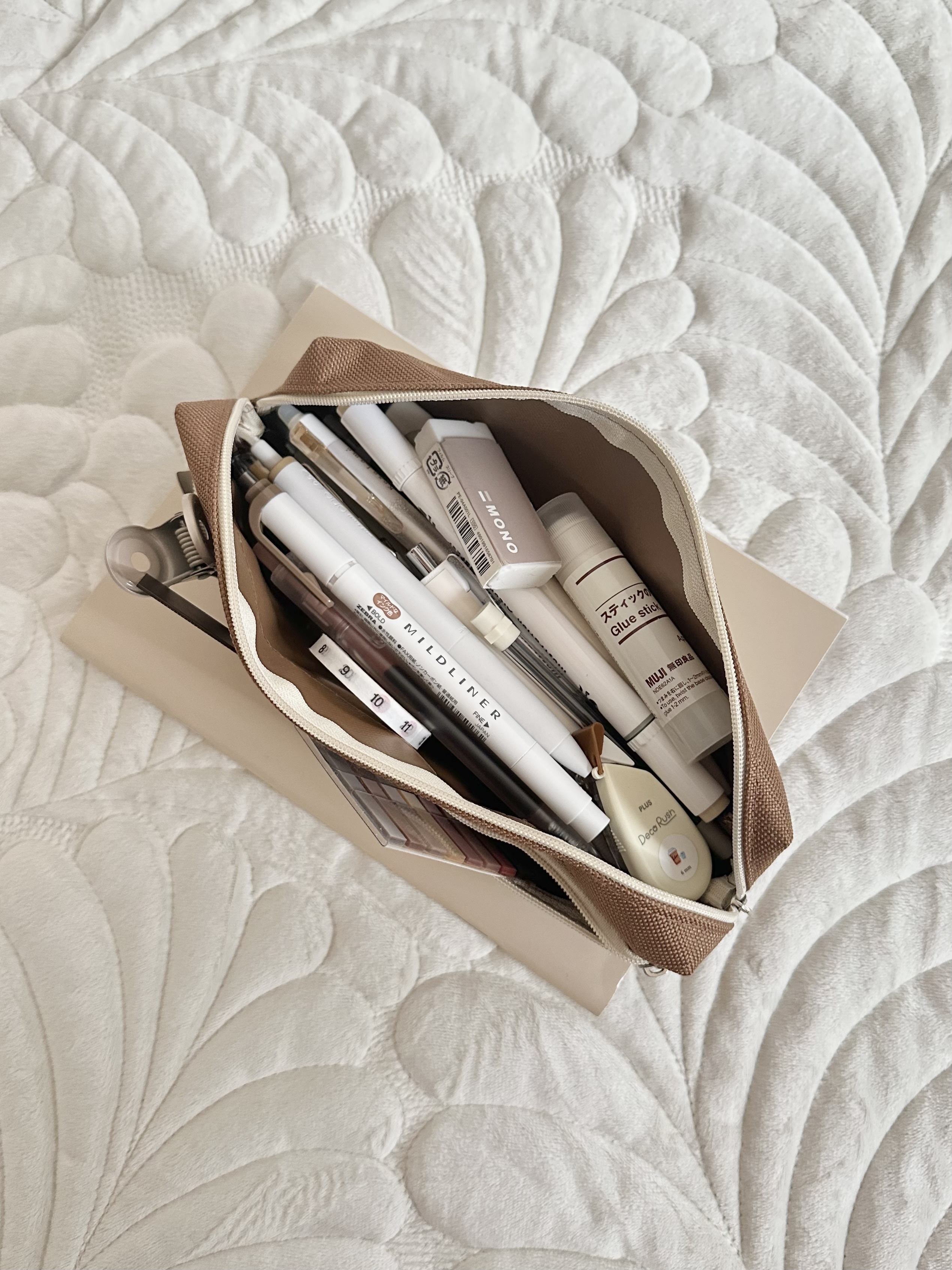 メインポケットは大容量で、ペンや文房具、小物までしっかり収納。自立する形なので、机の上でもすっきり整います。